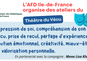L'AFD Île-de-France propose une activité de théâtre du vécu ouverte aux personnes vivant avec un diabète, ou leurs proches. Une représentation des saynètes sera organisée à la fin de l'année. Le prochain atelier aura lieu le mardi 14 (14h-17h) et le mercredi 15 avril (10h-17h), au local de l'association dans le 11ème.