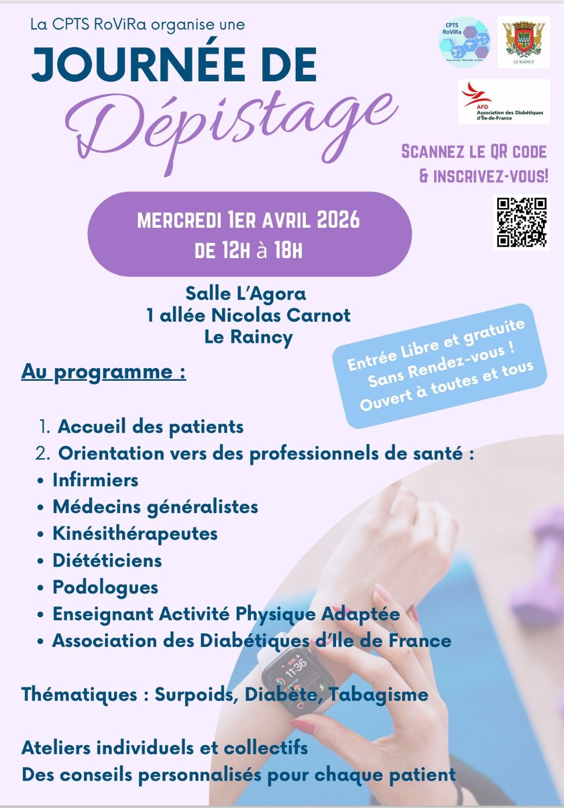 L'AFD Île-de-France sera présente avec un stand d'information et de prévention à cette journée de dépistage organisée par la CPTS RoViRa (Rosny- sous-Bois, Villemomble, Le Raincy).